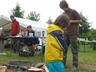 Camp hat was mit Camping zu tun, und solcher Art ist auch die Verpflegung. Leckeres gegrilltes und gekochtes vom offenen Feuer. Aber auch frische Salate, Kuchen und Obst waren zu bekommen. Und es sei hinzugefügt, daß selbstverständlich den Anforderungen des Gesundheitsamtes des Landkreises Genüge getan wurde, beispielsweise mit einer separaten Zone für das Küchenpersonal im Küchenzelt. Immerhin gab es in einem der letzten Jahre sogar Kontrollen, ob über dem Grill ein Dach sei - es könnte ja ein Vogel auf die Wurt ka****.